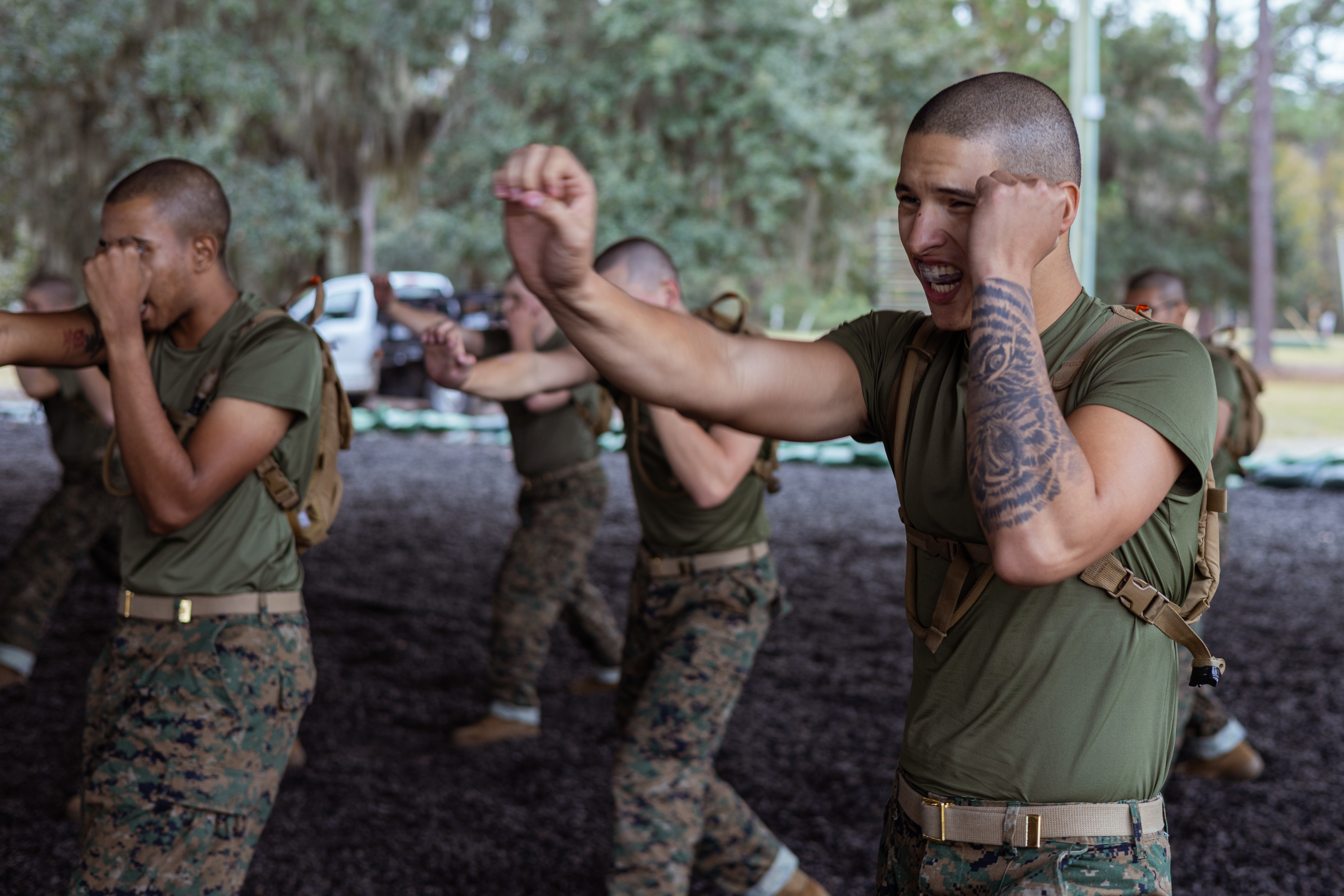 PARRIS ISLAND, SOUTH CAROLINA, UNITED STATES - Rct. Joshua Keltz, a recruit with Alpha Company, 1st Recruit Training Battalion, executes tan belt techniques as part of the Marine Corps Martial Arts Program on Marine Corps Recruit Depot Parris Island, S.C., Dec. 3, 2025. During recruit training, recruits are taught and must master basic assault and defense techniques to earn their tan belt through MCMAP. (U.S. Marine Corps photo by Lance Cpl. Ayden Cassano)